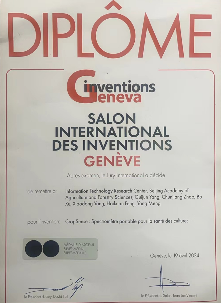 From April 16th to 21st, the 49th Geneva International Exhibition of Inventions took place in Geneva, Switzerland, drawing nearly 1100 inventive projects from over 40 countries and regions. The "CropSense Crop Growth and Health Detector," developed by the Remote Sensing Technology Department of NERCITA, was awarded the silver prize at the event.