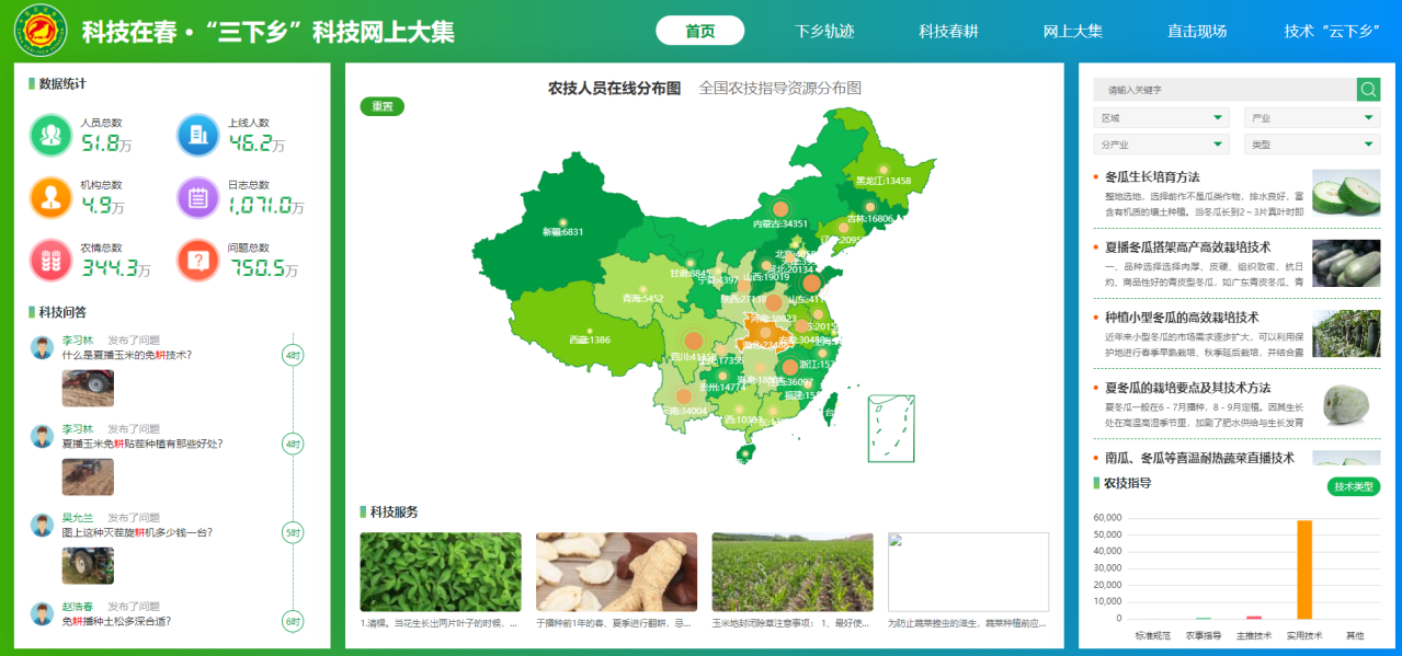 北京市农林科学院信息技术研究中心云上科技服务团通过承建运维的全国农业科教云平台全天候、扁平化优势全年面向农业专家、农技人员和农户提供在线成果发布、技术指导、短视频培训、产销信息撮合、直播课堂等服务支撑,为农户提供了点对点咨询全国农技员和专家的通道,也为农业专家面向全国用户快速便捷发布科研成果提供了环境;同时在春耕、夏管、秋收等季节举办科技在春、服务三夏、科技在秋等三下乡科技网上大集集中活动。