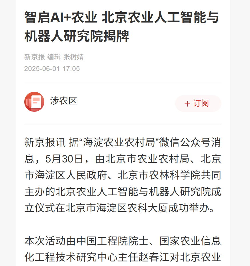 据“海淀农业农村局”微信公众号消息,5月30日,由北京市农业农村局、北京市海淀区人民政府、北京市农林科学院共同主办的北京农业人工智能与机器人研究院成立仪式在北京市海淀区农科大厦成功举办。