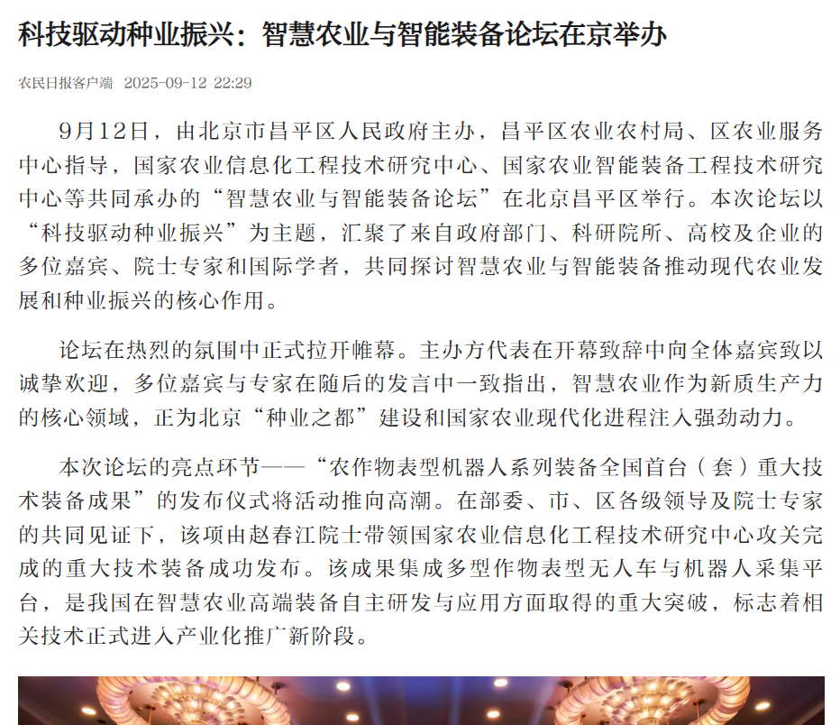 9月12日,由北京市昌平区人民政府主办,昌平区农业农村局、区农业服务中心指导,国家农业信息化工程技术研究中心、国家农业智能装备工程技术研究中心等共同承办的“智慧农业与智能装备论坛”在北京昌平区举行。本次论坛以“科技驱动种业振兴”为主题,汇聚了来自政府部门、科研院所、高校及企业的多位嘉宾、院士专家和国际学者,共同探讨智慧农业与智能装备推动现代农业发展和种业振兴的核心作用。