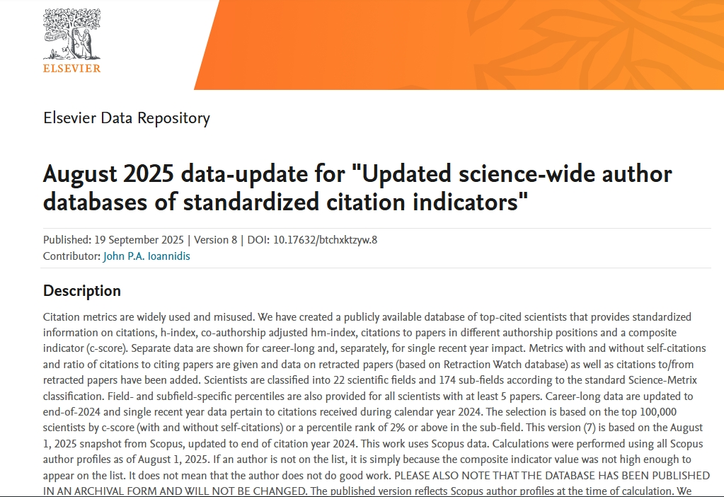 据悉,榜单基于Scopus数据库的引用数据系统分析,从全球近700万名科学家中,通过基于其论文引用数、h因子、合著者修正的hm因子、单独或第一作者的文章引用数等综合参数,遴选出世界排名前2%的236313名科学家,涵盖22个领域和174个子领域。中国大陆有31685名科学家入选,占13.4%。其中,“终身影响力”榜单统计科学家职业生涯期间的综合表现,“年度影响力”榜单则聚焦上一年度的学术影响力。